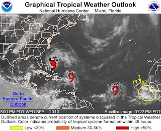 Tropical Storm Gaston (Beauty and the Beast comes to mind) had maximum sustained winds at 40mph and is moving West at 15mph and is currently on a B-line for Puerto Rico and the Dominican Republic.  The storm is predicted to gradually strenghten as a Tropical Storm over the next 72 hours and stay on its current heading.  This storm is far enough South in the Atlantic that without a strong turn to the North in the next week, has a good chance of making it into the Eastern Caribbean or the Gulf of Mexico.  But this is still a ways out.