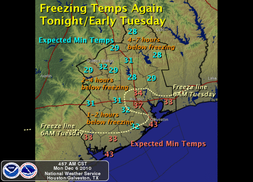 Temperatures are predicted to bottom out at 28-32 degrees in these areas Tuesday morning. Temperatures could remain below freezing for as long as 6 hours in the northern portions of Southeast Texas and 1-3 hours for the Houston Suburbs and inland portions of the coastal zones.