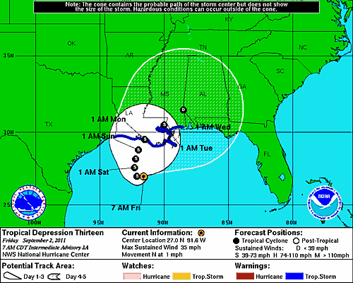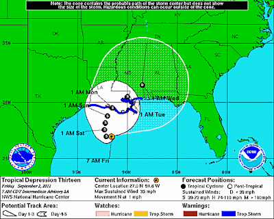 The tropical weather system in the Gulf of Mexico has been upgraded to Tropical Depression 13. It continues to strengthen and is forecast to develop into Tropical Storm Lee over the next few hours. At this time, without change in the current models and forecast, it is not anticipated to bring any hazardous precipitation into Texas coastal region.