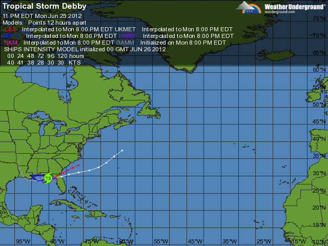 After 24-36 hours of low confidence forecasts and model data, Tropical Storm Debby still does not show to be a threat to the Texas Southern Region at this time.  Model data is still not in agreeance in the projected path of the storm.  Some models show a slow path to the West into Louisiana and others show a path similar to the current NHC projected forecast over NW Florida.  Although we will continue to monitor the storm through landfall, no more notices on Tropical Storm Debby will be issued by WxWarn unless Southern Texas again becomes threatened by the storm.