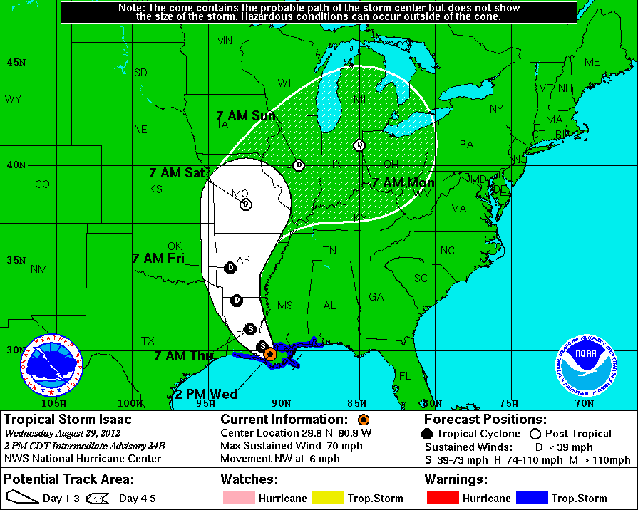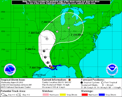After becoming a Category 1 Hurricane, becoming nearly stationary overnight, and making two landfalls over the Louisiana coast…Isaac has now been downgraded to Tropical Storm status.