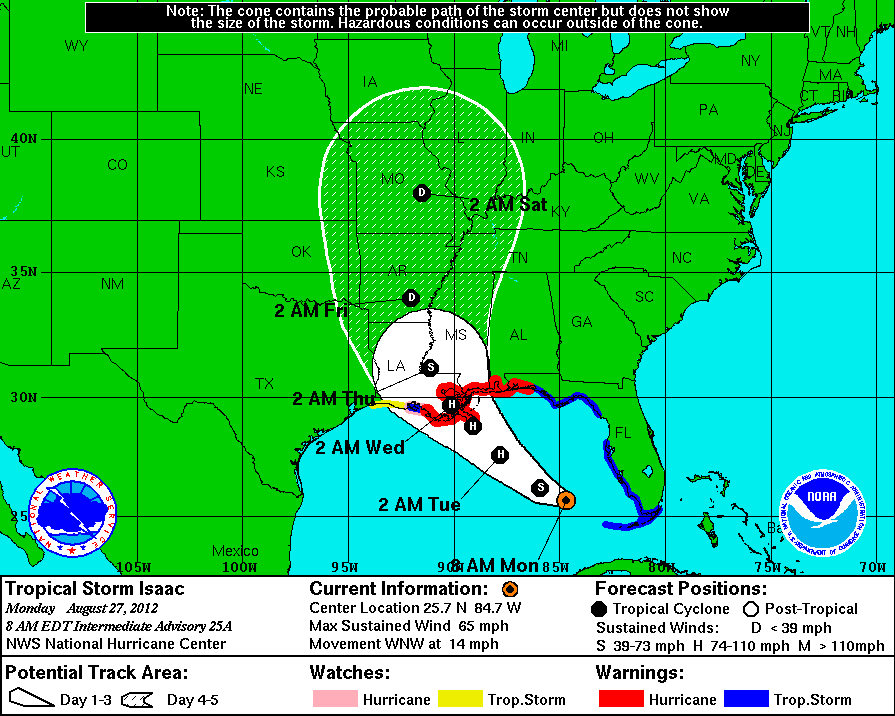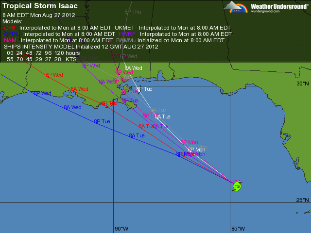 Tropical Storm Isaac, a storm originally intended to be a Florida and and East Coast Storm has made its way into the Gulf of Mexico over the weekend. The storm is predicted to strengthen into a hurricane early tomorrow morning and has the potential to become a Category 2 or 3 storm by landfall.