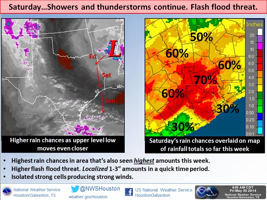 On Saturday, the system is expected to drop further south with higher precipitation chances north and east of the Highway 59 corridor line. This is predicted will bring additional 1-3 inches to an area that has already seen 5-8 inches of rainfall this week.